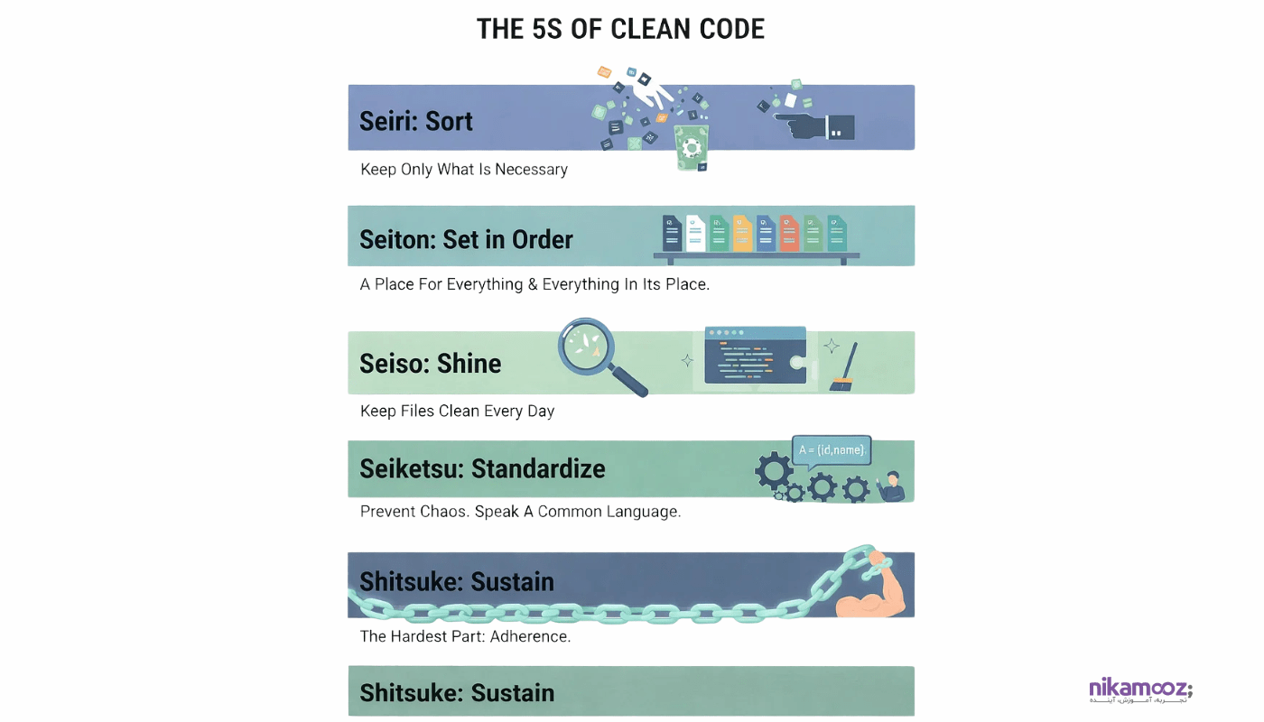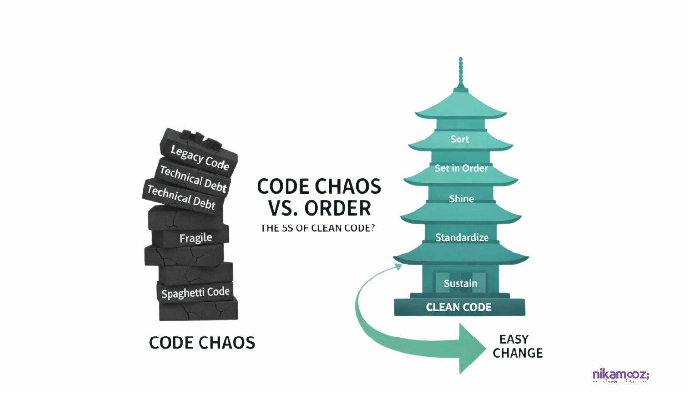 نیک آموز > وبلاگ > مهندسی نرم افزار > ۵ قانون مرتبط به Clean Code برگرفته از کتاب Uncle Bob ۵ قانون مرتبط به Clean Code برگرفته از کتاب Uncle Bob مهندسی نرم افزار نوشته شده توسط: رضا تجری تاریخ انتشار: ۰۶ دی ۱۴۰۴ آخرین بروزرسانی: 06 دی 1404 زمان مطالعه: 17 دقیقه ۰ (۰) این مقاله تلاش میکند به یک سوال به ظاهر ساده اما حیاتی در حوزه برنامهنویسی پاسخ دهد: چرا برخی از پروژهها با گذشت زمان پرهزینه، پرخطر و دشوار برای اصلاح میشوند؟ این مقاله صرفاً بر فناوری یا ابزارها تمرکز نمیکند، بلکه به ریشه اصلی آن میپردازد: طرز فکر و هنجارهای رفتاری کدنویسی. این مقاله با الهام از اصول و مفاهیم 5S ژاپنی از کد تمیز، چارچوبی را پیشنهاد میکند که نشان میدهد کیفیت کد محصول تغییرات لحظهای نیست؛ بلکه از یک سیستم دقیق، ساختاریافته و منظم حاصل میشود. اگر این سیستم به درستی ساخته شود، تغییرات کد میتواند از یک فرآیند پرخطر به یک فرآیند طبیعی تبدیل شود. چگونه کدی بنویسیم که تغییر دادنش دردسرساز نشود؟ اگر برنامهنویس باشید که قطعاً هستید، احتمالاً بارها وارد پروژهای شدهاید که از دور همهچیز مرتب و سالم به نظر میرسید، اما به محض اینکه خواستهاید یک خط کوچک را تغییر بدهید، ترس وجودتان را گرفته؛ ترسی که انگار کافیست یک قدم اشتباه بردارید تا کل سیستم مختل شود. این تجربه برای اکثر ما تکراری است: کد کار میکند، اما لمس کردنش جرئت میخواهد. انگار یک برج سست روی هم چیده شده است که اگر حتی یک آجرش را تکان بدهید، همهچیز فرو میریزد. این وضعیت اتفاقی نیست؛ ریشهاش برمیگردد به نبود نظم درونی کد. ما معمولاً عجله داریم: Deadline داریم، Feature جدید داریم، تحویل داریم. در چنین شرایطی، سرعت اولویت پیدا میکند و نظم و تمیزی کد عقب میافتد. در کتاب Clean Code اشاره شده، کیفیت تصادفی نیست. نظم باید ساخته شود، تقویت شود، نگهداری شود و جالب اینجاست که این نظم فقط مخصوص نرمافزار نیست؛ دههها قبل در کارخانههای ژاپنی سیستم نظافتی با عنوان 5S معرفی شد تا محیط کار را ساماندهی کند. بعدها دیده شد که این اصول فقط برای کارخانه نیست؛ میتوان آنها را در مدیریت، آموزش، حتی زندگی روزمره به کار برد و حالا نوبت برنامهنویسی است. در این مقاله میخواهیم 5S را از فضای صنعتی خارج کنیم و ببینیم چطور دقیقاً میتوان آن را روی Clean Code پیاده کرد. بعد از خواندن این مطلب، نهتنها کد تمیز را بهتر میفهمید، بلکه الگوی جدیدی برای نگاه کردن به پروژههایتان پیدا میکنید. با آموزش مهندسی نرمافزار در نیک آموز، 5S و Clean Code را در پروژهها و کدهای عملی اجرا کنید. Seiri – حذف اضافات (Sort) «فقط آنچه لازم است را نگه دار.» اولین S از 5S با یک حقیقت ساده شروع میشود: چیزهای اضافی نهتنها فضا را شلوغ میکنند، بلکه ذهن را هم قفل میکنند. در کدنویسی، این “اضافات” چه هستند؟ متغیرهایی که یک روز استفاده شدند و بعد رها شدند. متدهای قدیمی. کلاسهایی که هیچوقت پاک نشدند. بخشهایی از کد که شاید برای “روز مبادا” گذاشته شدهاند. Commentهای تاریخ گذشته. TODOهایی که هیچوقت قرار نیست انجام شوند. حذف این موارد فقط یک کار سطحی نیست. تحقیقات در روانشناسی شناختی ثابت کرده: شلوغی محیط کاری، شلوغی ذهن را زیاد میکند. این موضوع در کدنویسی هم صادق است. وقتی فایلهایتان پر از بخشهای بلااستفاده باشد، ناخواسته یک “بار ذهنی” اضافی به خودتان تحمیل میکنید. هر بار که کد را میخوانید، مغزتان باید تصمیم بگیرد: این لازم است؟ این کار میکند؟ این چرا اینجاست؟ این را باید اصلاح کنم یا نه؟ و این تصمیمهای کوچک، انرژی زیادی را از شما میگیرند. چرا حذف اضافات مهمتر از اضافه کردن امکانات است؟ بیشتر ما ناخودآگاه ترجیح میدهیم چیز جدید اضافه کنیم تا اینکه چیزی را پاک کنیم اما تا زمانی که فضای کار تمیز نشده باشد، هر افزونهٔ جدید خودش یک خطر است. در Clean Code هم آمده: اول تمیز کن، بعد بساز. ساختن روی کد شلوغ مثل چیدن کتاب روی میز خاکیست. شاید چند روز اول مشکلی نداشته باشد، اما بعد از مدتی میز را نمیتوانید ببینی