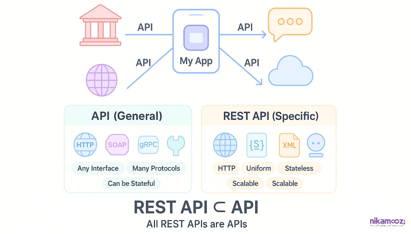 نیک آموز > وبلاگ > زبان های برنامه نویسی > تفاوت API و REST API تفاوت API و REST API زبان های برنامه نویسی نوشته شده توسط: تیم فنی نیک آموز تاریخ انتشار: ۳۰ آذر ۱۴۰۴ آخرین بروزرسانی: 30 آذر 1404 زمان مطالعه: 8 دقیقه ۰ (۰) برای شما پیش آمده که وقتی یک اپلیکیشن را باز میکنید، اطلاعات آن بهروز شود یا با فشردن یک دکمه، دادهای در سیستم ثبت شود، بدون اینکه دقیقاً بدانید این فرایند در پشت صحنه چگونه انجام میشود؛ در چنین موقعیتی است که API وارد عمل میشود. در واقع API، مانند یک مترجم بین نرمافزارها عمل میکند؛ شما درخواستی را برای آن ارسال میکنید، او به سراغ سرور یا سیستم دیگر میرود و نتیجه را برایتان برمیگرداند. زمانی که بیشتر با برنامهنویسی و وبسرویسها سروکار داشته باشید، نوع خاصی از API به نام REST API مطرح میشود که قوانین و اصول مشخص خود را دارد. در این مقاله، تفاوت API و REST API به زبانی ساده و قابل درک بررسی میشود. API چیست؟ API مخفف Application Programming Interface است و به زبان ساده، یک رابط بین نرمافزارها محسوب میشود. برای مثال، زمانی که یک اپلیکیشن سفارش غذا را باز میکنید و لیست رستورانها و منوها را مشاهده میکنید، در واقع اپلیکیشن از طریق یک API با سرور رستورانها در ارتباط است. API میتواند انواع مختلفی داشته باشد، از جمله: Web API: رابطی که روی وب و معمولاً مبتنی بر HTTP کار میکند. Library API: رابطهایی که از طریق کتابخانههای نرمافزاری در کد استفاده میشوند. Hardware API: رابطهایی برای ارتباط با سختافزار، مانند چاپگر یا دوربین. چرا API مهم است؟ سرعت توسعه را بهطور قابلتوجهی افزایش میدهد. از دوبارهکاری و پیادهسازیهای تکراری جلوگیری میکند. به استانداردسازی و افزایش امنیت سیستم کمک میکند. بهطور خلاصه API، مانند یک درِ ورودی کنترلشده بین سیستمهاست که اجازه میدهد دادهها و دستورات بین آنها رد و بدل شود. باجامعترین و کاملترین دوره آموزش برنامهنویسی با ما همراه باشید. REST API چیست؟ REST API نوع خاصی از Web API است که اصول REST مخفف (Representational State Transfer) را رعایت میکند. این اصول باعث میشوند ارتباط بین کلاینت و سرور ساده، یکنواخت و قابلپیشبینی باشد. ویژگیهای اصلی REST API Client–Server: نقش کلاینت و سرور از هم جدا و مشخص است. Stateless: هر درخواست مستقل از درخواست قبلی است و تمام اطلاعات لازم را با خود حمل میکند. Cacheable: امکان ذخیرهسازی (کش کردن) پاسخها برای بهبود سرعت وجود دارد. Layered System: معماری میتواند لایهای باشد و بین کلاینت و سرور لایههای واسط وجود داشته باشد. Uniform Interface: رابط یکنواخت و ساده برای تعامل با منابع دارد. مثال واقعی: وقتی شما از یک اپلیکیشن شبکه اجتماعی استفاده میکنید و قصد مشاهده پستها را دارید، اپلیکیشن یک درخواست به REST API سرور ارسال میکند و دادهها در قالب یک فرمت استاندارد مانند (JSON) به اپلیکیشن برگردانده میشوند. چرا باید REST API را یاد بگیرید؟ محبوبیت بالایی در میان توسعهدهندگان دارد. توسعه و نگهداری آن نسبتاً ساده و سریع است. ابزارها و مستندات فراوانی برای تست و مانیتورینگ آن وجود دارد. امکان اتصال به سرویسها و سیستمهای مختلف و ترکیب آنها را فراهم میکند. مثال عملی: فرض کنید قصد دارید اپلیکیشنی بسازید که همزمان با سیستم بانکی، شبکه اجتماعی و یک سرویس ابری در ارتباط باشد. در صورتی که با REST API آشنا باشید، میتوانید این سرویسها را با پیچیدگی کمتر و با کدی تمیز و قابلنگهداری به اپلیکیشن خود متصل کنید. تفاوتهای کلیدی بین API و REST API برای درک بهتر تفاوت API و REST API، میتوان به نکات زیر توجه کرد: ۱.تعریف و مفهوم API: یک رابط کلی بین نرمافزارهاست. هر سیستم میتواند API خود را برای ارتباط با سایر برنامهها ارائه دهد. REST API: نوع خاصی از API است که بر اساس اصول معماری REST طراحی شده و معمولاً برای ارتباط مبتنی بر وب (HTTP) استفاده میشود. ۲.پروتکلها و سبک ارتباط API: ممکن است از پروتکلهای مختلفی مانند HTTP ،SOAP ،gRPC یا حتی پروتکلهای اختصاصی استفاده کند. REST API: همیشه مبتنی بر HTTP است و از فرمتهای استانداردی مانند JSON یا XML برا