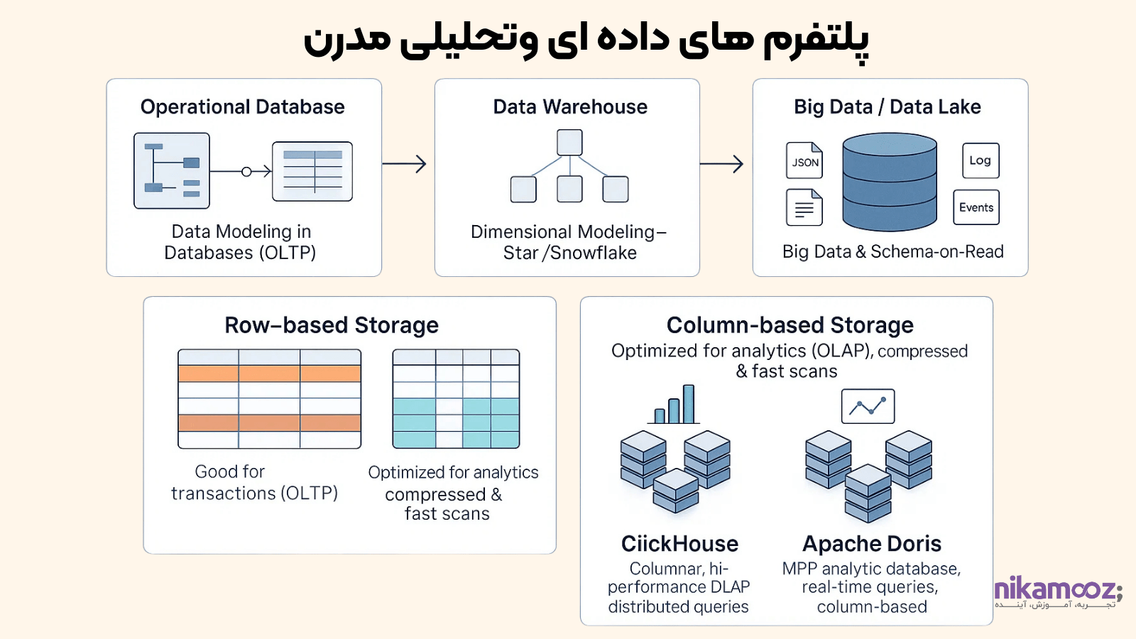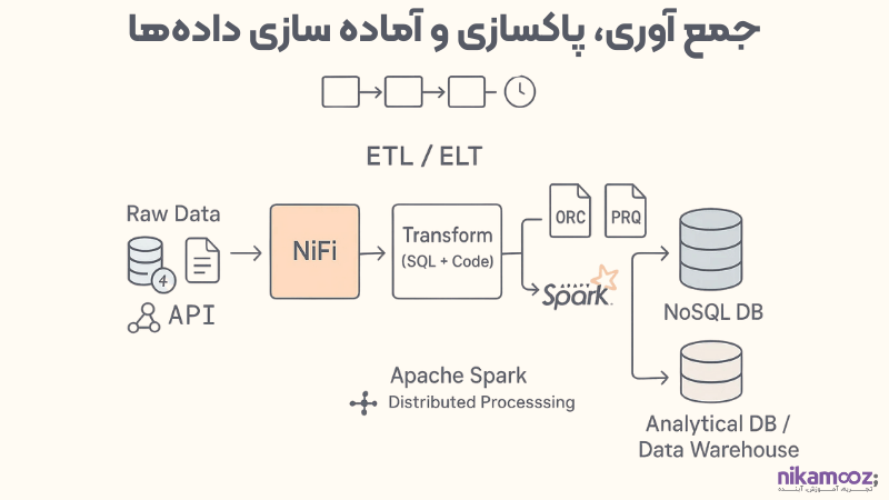 دوره مهندسی داده برای ورود عملی به دنیای بیگ‌ دیتا و زیرساخت‌های داده طراحی شده است؛ از نقش مهندس داده، کار با لینوکس، پایتون و جاوا، تا پایگاه‌های NoSQL مثل MongoDB، داده‌های جریانی با Kafka، تحلیل روی ClickHouse و Doris و پیاده‌سازی ETL/ELT و پردازش توزیع‌شده با Spark ،NiFi و Airflow همگی در قالب سناریوهای واقعی آموزش داده می‌شوند. این دوره به‌صورت حرفه‌ای و پروژه‌محور در نیک‌ آموز ارائه می‌شود .