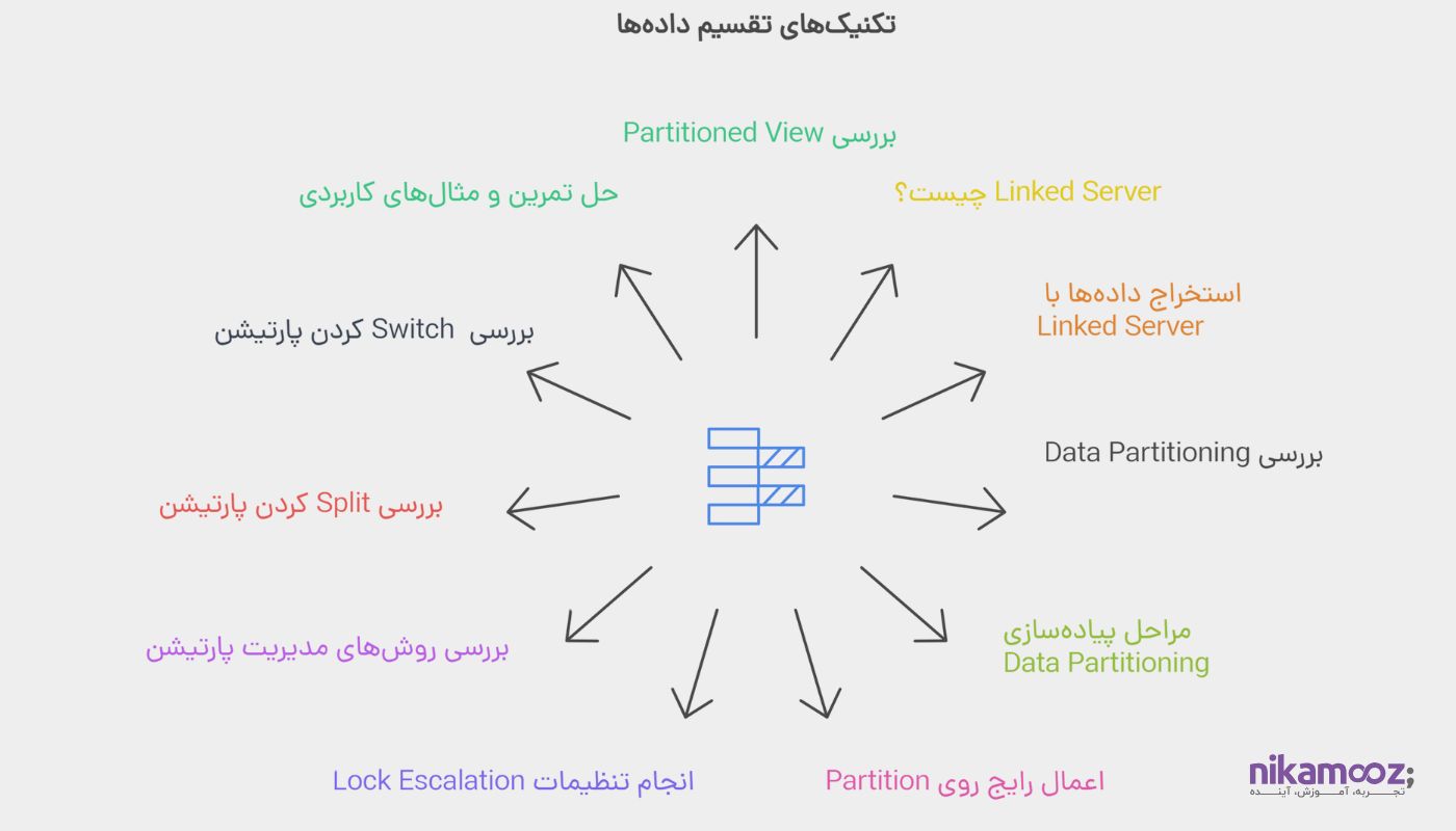 ▪️ بررسی تکنیکهای تقسیم دادهها ▪️ بـررسی Partitioned View ▪️ Linked Server چیست؟ ▪️ استخراج دادهها با Linked Server ▪️ بررسی Data Partitioning ▪️ مراحل پیادهسازی Data Partitioning ▪️ اعمال رایج روی Partition ▪️ انجام تنظیمات Lock Escalation ▪️ بررسی روشهای مدیریت پارتیشن ▪️ بررسی Split کـردن پـارتیشن ▪️ بررسی Switch کردن پارتیشن ▪️ حل تمرین و مثالهای کاربردی