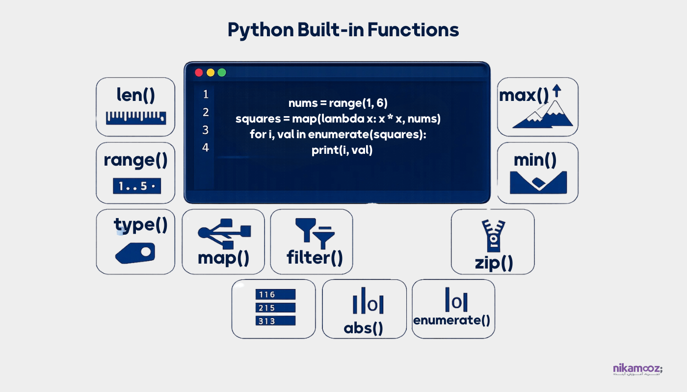 ▪️ ()len: نمایش طول متن یا تعداد کاراکتر آن ▪️ ()Range: تولید دنبالهای از اعداد صحیح ▪️ ()Type: برگرداندن نوع یک شی ▪️ ()Map: اعمال یک تابع برای همه آیتمهای یک لیست ▪️ ()Filter ▪️ ()zip ▪️ ()Enumerate ▪️ ()Max ▪️ ()Min ▪️ ()Abs