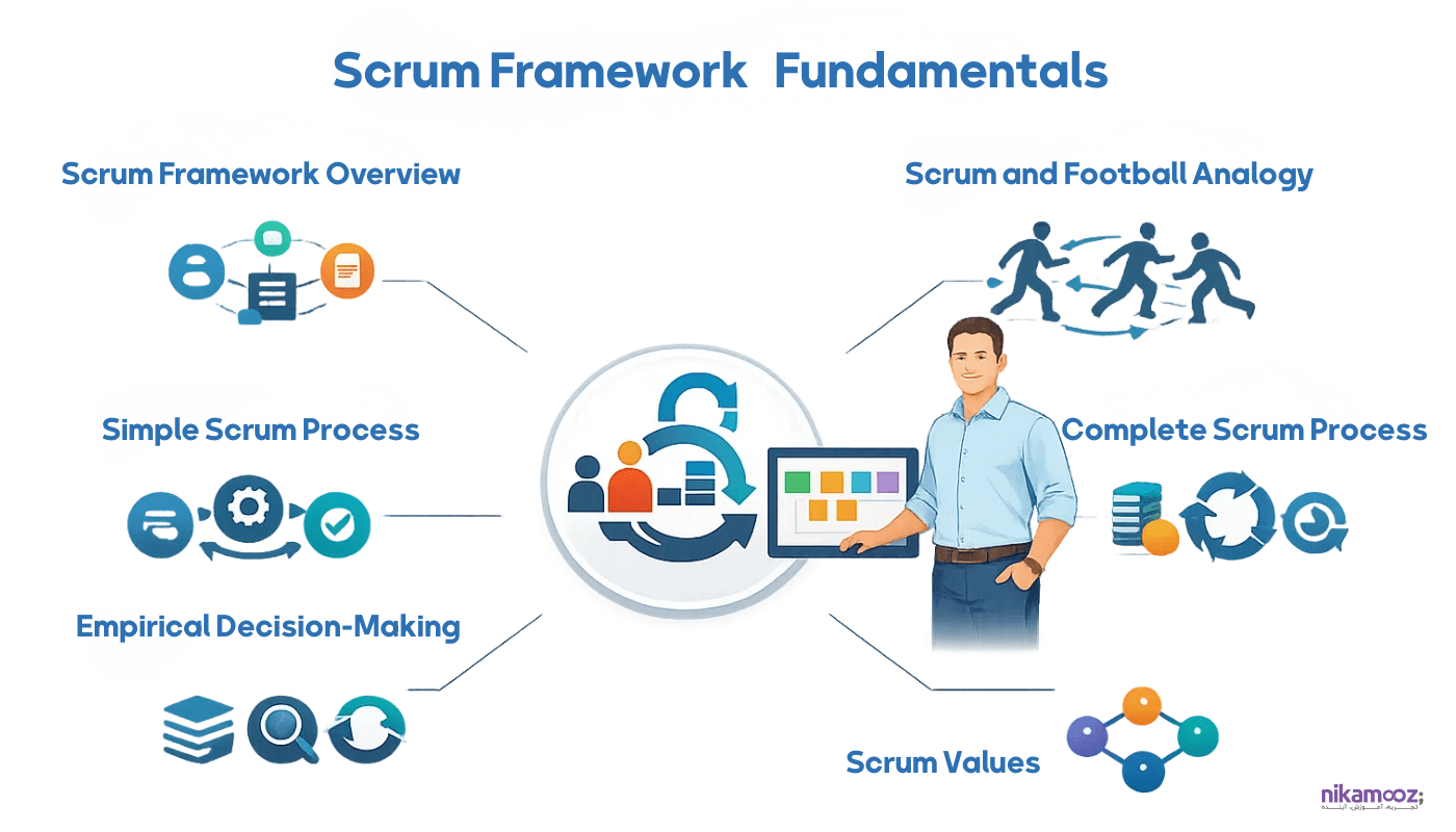 در این بخش دانش پذیر با پنج ارزش کلیدی اسکرام (Focus ،Courage ،Openness ،Respect ،Commitment) و اصول تصمیم گیری تجربی (Empiricism) آشنا میشود. تمرکز بر فهم فلسفه پشت اسکرام است، نه صرفاً اجرای مکانیکی آن.