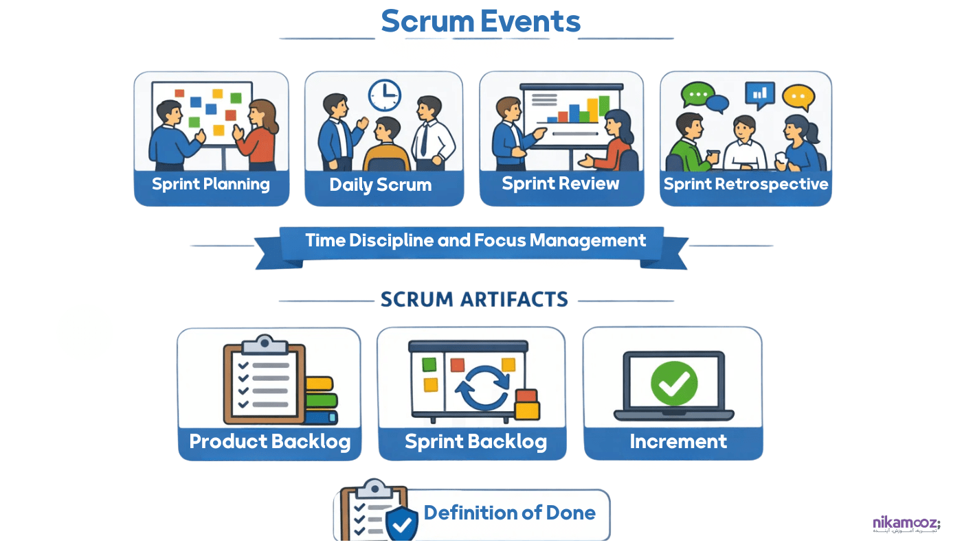 در این فصل با تمام رویدادهای رسمی اسکرام و خروجیهای مورد انتظار از هرکدام آشنا میشوید. تمرکز بر نحوه مدیریت زمان، هدف و خروجی هر رویداد است.