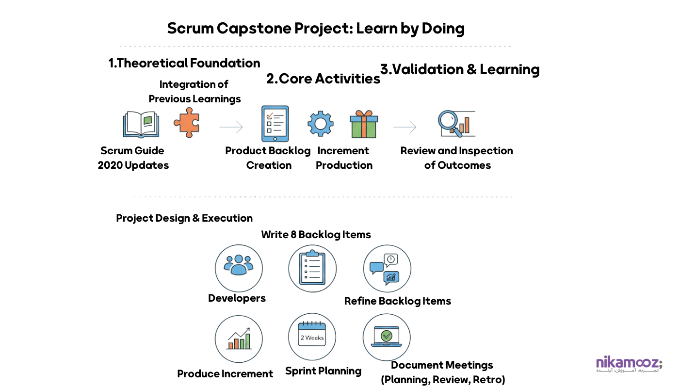 در این فصل هنرجو آنچه تا اینجا یاد گرفته را در قالب یک پروژه کوچک تمرینی پیادهسازی میکند تا درک عملی از نقشها، بکلاگ، اسپرینت و جلسات داشته باشد.