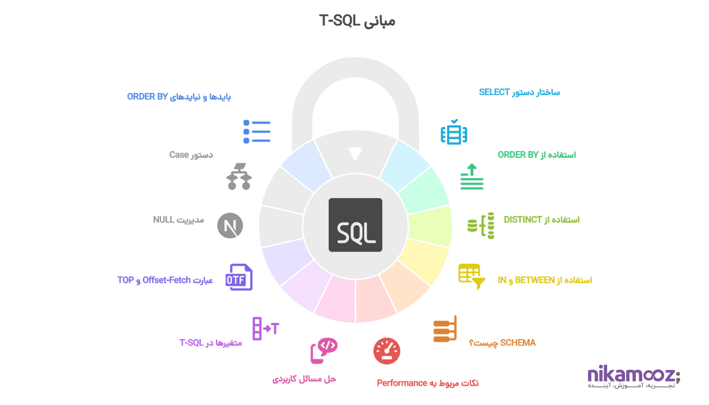 ▪️ ساختار دستور SELECT ▪️ استفاده از عبارت ORDER BY ▪️ استفاده از دستور DISTINCT ▪️ استفاده از IN و BETWEEN ▪️ استفاده از عبارت DISTINCT ▪️ SCHEMA چیست؟ ▪️ بررسی نکات مهم مربوط به Performance ▪️ حل و ارائه مسائل کاربردی ▪️ متغیر (Variable) چیست؟ ▪️ عبارت TOP و Offset-Fetch ▪️ مدیریت NULL ▪️ دستور Case در SQL ▪️ بایدها و نبایدهای استفاده از عبارت ORDER BY در کوئریها