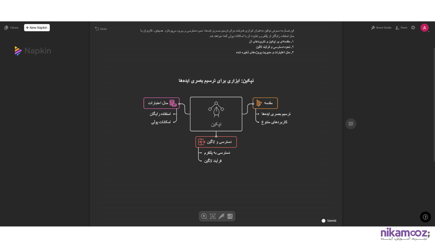 این فصل به معرفی نپکین بهعنوان ابزاری قدرتمند برای ترسیم بصری ایدهها، نحوه دسترسی و ورود میپردازد. همچنین، کاربران با مدل استفاده رایگان از پلتفرم و تفاوت آن با امکانات پولی آشنا خواهند شد.