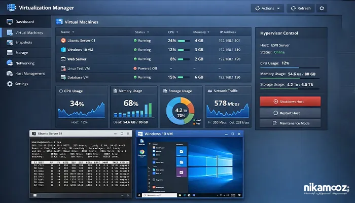 نیک آموز > وبلاگ > SQL Server > مجازی سازی چیست؟ از مفاهیم پایه تا کاربرد VMware در ۲۰۲۶ مجازی سازی چیست؟ از مفاهیم پایه تا کاربرد VMware در ۲۰۲۶ SQL Server مجازی سازی نوشته شده توسط: رضا اردانه تاریخ انتشار: ۱۷ تیر ۱۳۹۷ آخرین بروزرسانی: 28 بهمن 1404 زمان مطالعه: 10 دقیقه ۰ (۰) مجازی سازی یکی از مهمترین فناوریهای زیرساختی در دنیای فناوری اطلاعات است که امکان اجرای چندین سیستمعامل و سرویس را روی یک سختافزار فیزیکی فراهم میکند. با استفاده از این فناوری میتوان چندین ماشین مجازی مستقل ایجاد کرد که هرکدام منابع اختصاصی خود را دارند، بدون اینکه عملکرد یکدیگر را مختل کنند. این رویکرد باعث استفاده بهینه از منابع سختافزاری و کاهش هزینههای عملیاتی میشود. در ادامه بررسی میکنیم مجازی سازی دقیقاً چیست، چگونه کار میکند و چه مزایا و کاربردهایی در سازمانها و مراکز داده دارد. از بهینهسازی سرورها گرفته تا ایجاد محیطهای تست و توسعه، این فناوری به یکی از ارکان اصلی زیرساختهای مدرن تبدیل شده است. اگر در ۱۴۰۵ با دیتابیسهای سازمانی، زیرساخت ابری یا مهاجرت شغلی کار میکنید، مجازیسازی SQL Server روی VMware vSphere یکی از مهارتهای کلیدی و پولساز بازار است. این دوره شما را از سطح عملیاتی تا طراحی معماری Enterprise جلو میبرد. طراحی و پیادهسازی SQL Server در محیطهای Virtualized (HA / DRS / vSAN) بهینهسازی Performance، I/O و Licensing در vSphere سناریوهای واقعی دیتاسنتر و سازمانهای Enterprise مهارت مکمل برای DBA، Cloud Engineer و Infrastructure Architect افزایش مستقیم ROI سازمان و ارزش رزومه برای مهاجرت شغلی دوره حرفهای مجازیسازی SQL Server با VMware vSphere فهرست محتوایی Toggle مجازی سازی چیست؟نحوه کار مجازی سازی به چه صورت است؟انواع مجازی سازیمزایا و معایب مجازی سازیرویکردهای مجازیسازی VMware: از Hypervisor تا مدیریت منابع در محیطهای مجازیمعماری Hypervisor در مجازیسازی: بررسی کامل انواع و نحوه کارکردحفاظت از اطلاعات در vSphere: راهکارهای VMware برای بکاپ و بازیابی ماشینهای مجازیراهکارهای مشترک VMware با شرکتهای فناوری: همکاری با Cisco، HPE و EMCسخن پایانی مجازی سازی چیست؟ از مفاهیم پایه تا کاربرد VMware در ۲۰۲۶نیک آموز | آموزش مهارتمحور برای بازار کار و مهاجرت سوالات متداول مجازی سازی چیست؟ از مفاهیم پایه تا کاربرد VMware در ۲۰۲۶سوال ۱: مجازی سازی دقیقاً چه کاری انجام میدهد؟سوال ۲: Hypervisor چه نقشی در مجازی سازی دارد؟سوال ۳: چه مزایایی استفاده از مجازی سازی دارد؟سوال ۴: چه معایبی ممکن است مجازی سازی داشته باشد؟سوال ۵: انواع مجازی سازی شامل چه مواردی هستند؟سوال ۶: چه تفاوتی بین Hypervisor مبتنی بر سیستمعامل و مستقل وجود دارد؟سوال ۷: ابزارهای حفاظت از اطلاعات در محیط مجازی چگونه عمل میکنند؟بیشتر بدانید: مجازی سازی چیست؟ مجازی سازی چیست؟ مجازی سازی فناوریای است که با استفاده از یک لایه نرمافزاری به نام هایپروایزر، منابع سختافزاری یک سیستم فیزیکی مانند پردازنده، حافظه و فضای ذخیرهسازی را به چند بخش مستقل تقسیم میکند تا چندین ماشین مجازی بهصورت همزمان روی یک سرور اجرا شوند. هر ماشین مجازی مانند یک کامپیوتر واقعی عمل میکند و میتواند سیستمعامل و نرمافزارهای مخصوص خود را داشته باشد، بدون اینکه با سایر ماشینها تداخل پیدا کند. این روش باعث افزایش بهرهوری منابع، کاهش هزینههای سختافزار و سادهتر شدن مدیریت و توسعه زیرساختهای IT میشود. با کمک مفهوم مجازی سازی، به خصوص استفاده از معماری مجازیسازی VMware مدیران حوزههای IT در مجموعههای مختلف میتوانند چالشهای زیر را پاسخگو باشند: جلوگیری از هدر رفت منابع پردازشی نصب شده بر روی سرور با ایجاد ماشینهای مجازی به جای استفاده از سرورهای فیزیکی. امکان استفاده از هر نوع سیستم عامل در یک مجموعه سختافزار موجود. مدیریت فضای فیزیکی مرکز داده از طریق نصب حداقل سرورهای مورد نیاز پایگاه داده. مدیریت کابل کشیهای متعدد در فضای مرکز داده و در نتیجه صرفهُجویی در مصرف کابلها و تجهیزات وابسته. ایجاد محیطهای تست و توسعه با سرعت ب