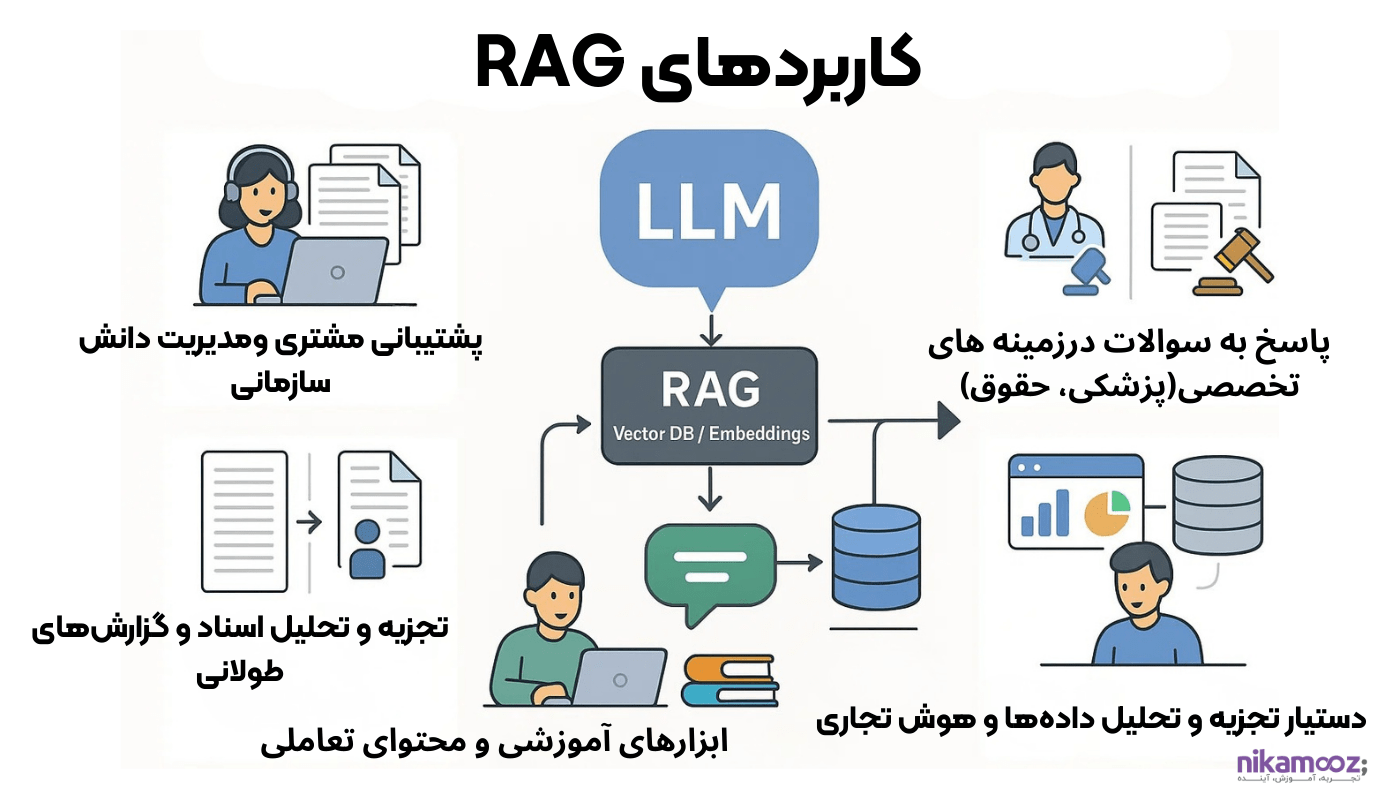 نیک آموز > وبلاگ > هوش مصنوعی > RAG (Retrieval-Augmented Generation) چیست و چگونه آن را دستیار AI می دانیم؟ RAG (Retrieval-Augmented Generation) چیست و چگونه آن را دستیار AI می دانیم؟ هوش مصنوعی LLM نوشته شده توسط: تیم فنی نیک آموز تاریخ انتشار: ۱۰ خرداد ۱۴۰۳ آخرین بروزرسانی: 17 آذر 1404 زمان مطالعه: 12 دقیقه ۴.۱ (۲۰) Retrieval-Augmented Generation) RAG) یک الگوی طراحی برای سیستمهای هوش مصنوعی مبتنی بر مدلهای زبانی در مقیاس بزرگ است. این الگو قبل از تولید پاسخ، ابتدا دانش را از منابع اطلاعاتی خارجی بازیابی میکند. در این رویکرد، مدل زبانی نه تنها به دادههای آموزشی اولیه خود متکی است، بلکه ابتدا اسناد مرتبط را از یک پایگاه دانش (مانند پایگاه داده برداری، موتور جستجو یا مخزن اسناد سازمانی) بازیابی میکند، سپس این اطلاعات را با دانش داخلی خود ترکیب میکند تا پاسخ را تولید کند. مزیت این مکانیسم این است که در مسائل دانش محور، از نیاز به صرف منابع قابل توجه برای آموزش مجدد مدل با هر بهروزرسانی دادهها، جلوگیری میکند و میتواند دقت، قابلیت استناد و بهموقع بودن پاسخ را بهبود بخشد؛ بنابراین، RAG به یکی از مدلهای اصلی در طراحی دستیاران سازمانی هوشمند، سیستمهای پرسش و پاسخ حرفهای و ابزارهای تحلیلی مبتنی بر مدل زبانی تبدیل شده است. برای درک بهتر مفهوم RAG و نقش آن در معماری هوش مصنوعی، توصیه میشود ابتدا مقاله “مدل زبانی در مقیاس بزرگ (LLM) چیست؟” را مطالعه کنید. مدلهای زبانی در مقیاس بزرگ (LLM) یک فناوری هوش مصنوعی هستند که برای تشخیص و تولید متن استفاده میشوند و امروزه به یک شایستگی اصلی برای اکثر سازمانها تبدیل شدهاند. در اصل، RAG روشی است که اطلاعات فعلی یا مرتبط را از پایگاههای داده خارجی استخراج کرده و آن را در اختیار هوش مصنوعی مبتنی بر LLM قرار میدهد. هنگامیکه کاربر دستورالعمل خاصی را به هوش مصنوعی میدهد و مدل نیاز به تولید پاسخ دارد، RAG مداخله کرده و اطلاعات را از منابع معتبر ذخیره شده در یک پایگاه داده برداری بازیابی میکند؛ در نهایت، هر پاسخ دارای معنا و مفهوم نسبتاً صحیحی است و درنتیجه احتمال خطاهای مدل را کاهش میدهد. برای شناخت عمیق RAG و دیگر تکنیکهای روز هوش مصنوعی، با جامعترین دورهی آموزش هوش مصنوعی با ما همراه باشید. تاریخچه و توسعه RAG ایده ترکیب بازیابی اطلاعات با تولید زبان طبیعی، دهههاست که در تحقیقات بازیابی اطلاعات و پاسخ به پرسش، از سیستمهای کلاسیک پاسخ به پرسش دهه ۱۹۹۰ تا مسابقاتی مانند TREC، مطرح شده است. با این حال، اصطلاح و چارچوب «تولید افزوده بازیابی» (RAG) تا زمان انتشار مقالهای توسط لوئیس و همکارانش در کنفرانس NeurIPS در سال ۲۰۲۰، به طور رسمی مطرح نشده بود. این مقاله RAG را به عنوان یک معماری ترکیبی تعریف میکرد که مدلهای زبان مولد را با ماژولهای بازیابی سند ترکیب میکند و آن را نسبت به مدلهای صرفاً مولد در مسائل دانشمحور برتر میسازد. قبل از پیشنهاد رسمی RAG، برنامه واتسون IBM در مسابقه Jeopardy و برخی از موتورهای جستجوی مبتنی بر پرسوجو نیز از ترکیبی از تکنیکهای بازیابی و تولید پاسخ استفاده میکردند. با این حال، این سیستمها عمدتاً مبتنی بر مدلهای آماری و قوانین تولید دستی بودند و فاقد یک چارچوب یکپارچه مانند RAG بودند که برای دوران مدلهای زبانی در مقیاس بزرگ قابل استفاده باشد. پس از انتشار مقاله لوئیس و همکارانش، تحقیقات RAG به سرعت تکامل یافته و اکنون در مقالات مروری و راهنماهای صنعتی به نسلهای مختلفی مانند «RAG ساده»، «RAG پیشرفته» و «معماری RAG ماژولار» طبقهبندی میشود. این معماریها درحال حاضر به طور گسترده توسط محصولات مختلف شرکتهایی مانند مایکروسافت، گوگل، AWS، OpenAI و ارائه دهندگان پلتفرم سازمانی پذیرفته شدهاند. RAG چگونه کار می کند؟ معماری RAG معمولاً از چهار مرحله اصلی تشکیل شده است: نمایش و نمایهسازی دادهها، بازیابی، بهبود متن ورودی و تولید. ۱.نمایهسازی و برداریسازی دادهها در مرحله آمادهسازی، فایلهای متنی، کد، گزارشها یا سایر منابع دانش به قطعات کوچکتر ت
